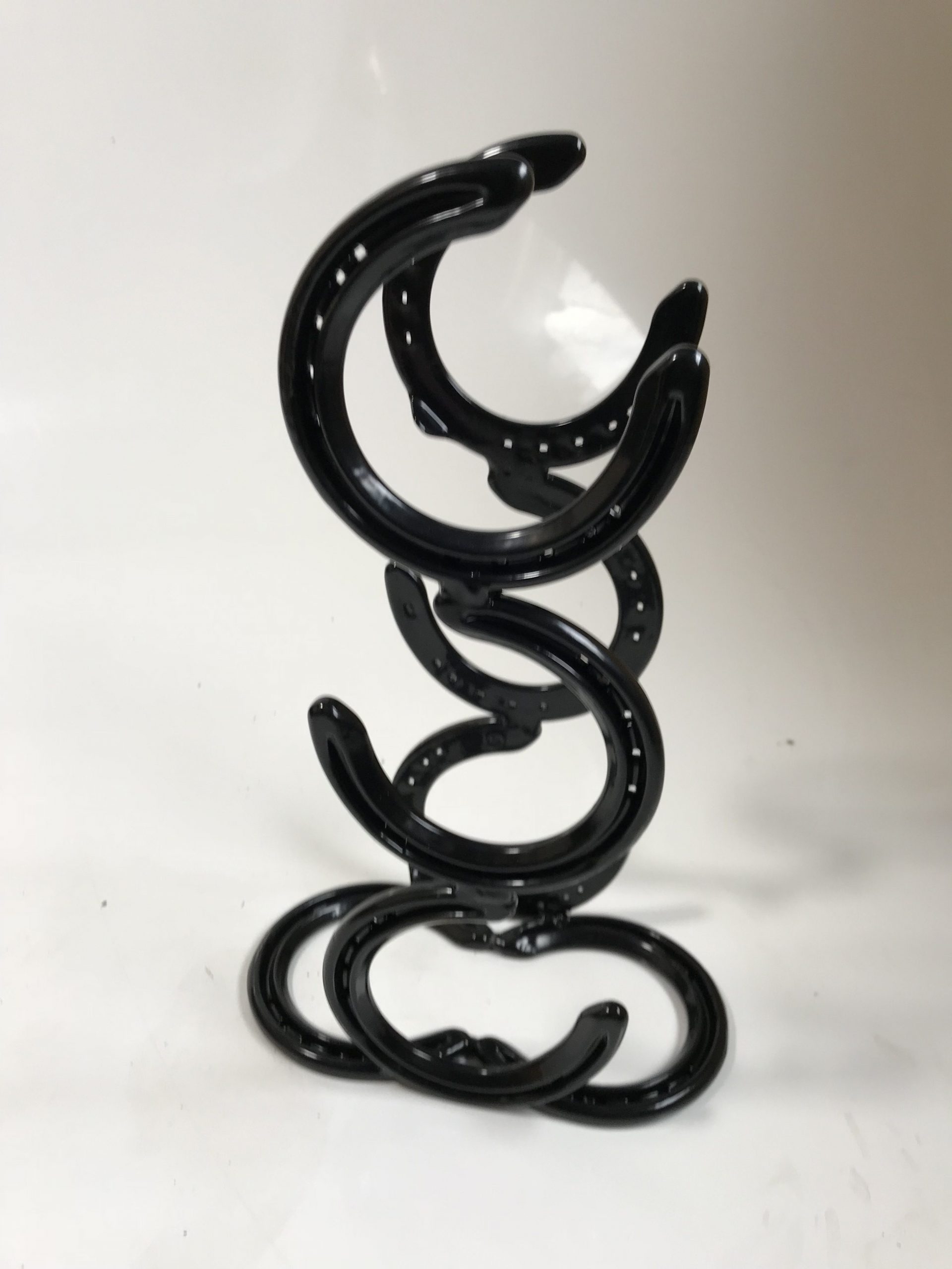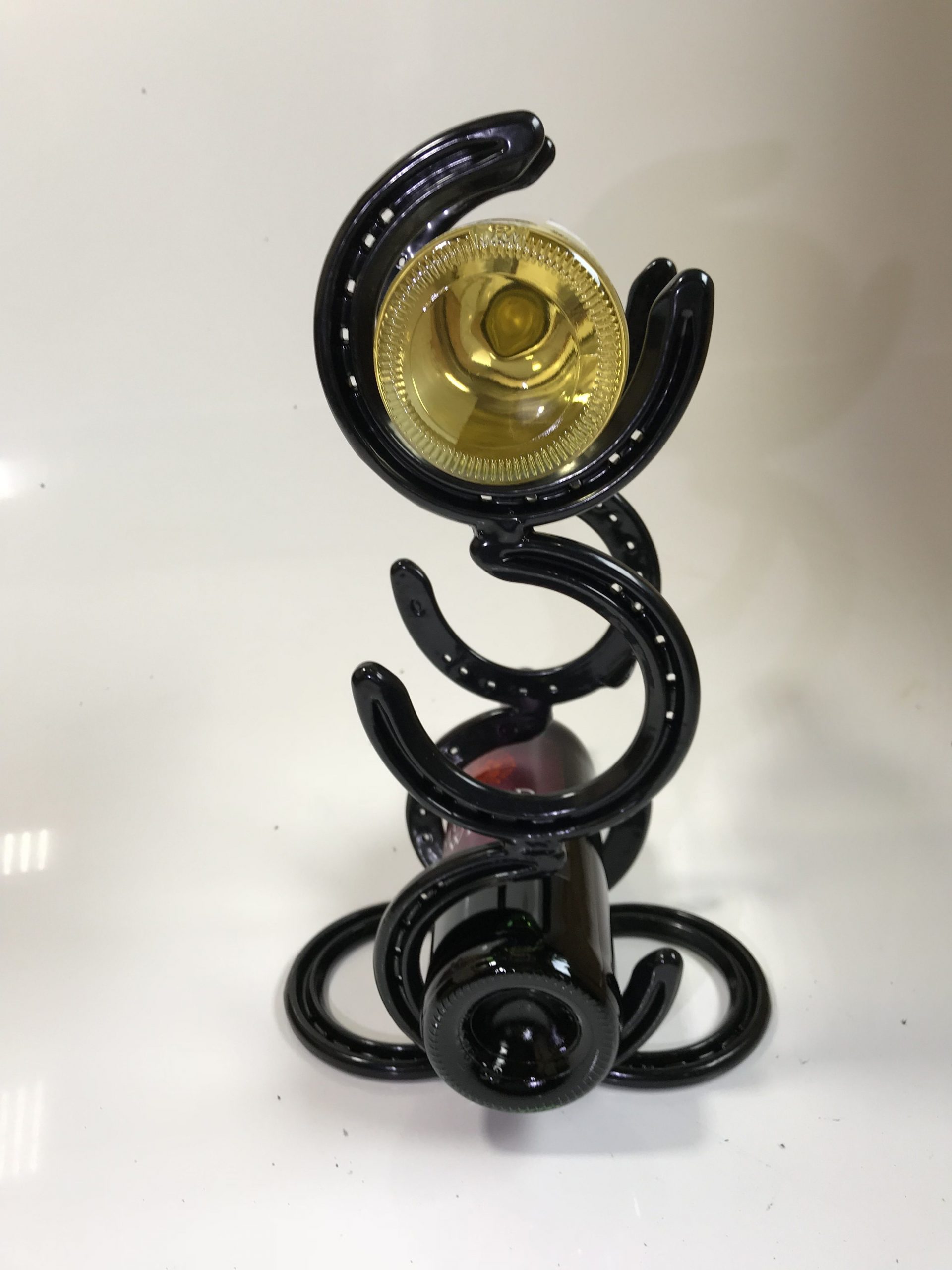 3 Bottle vertical Horseshoe Wine Rack made from new shoes and powder coated glass black. Fabricated in our own workshops to our usual high standard. Approx. Dimensions W – 13 cm H – 40 cm D – 13 cm